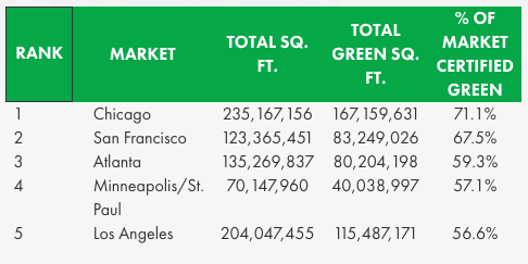 芝加哥连续第三年获得顶点,71.1%的空间经绿色认证上年中西部市记录到69.8%,比上年略有增加第二位旧金山大有建树,今年从64%升至67.5,创下最大百分数增益,西雅图第九位同比亚特兰大保留第三点59%以上空间绿色认证,明尼阿波利斯57%移动到第四点57%跨过洛杉矶,目前前5位56.6%。