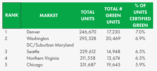 丹佛取顶点7%市场多家庭公寓认证为“绿化”,随后华盛顿市/郊区马里兰州6.9%和西雅图6.5%
