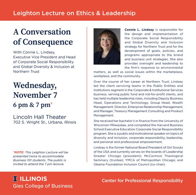 今年的雷顿讲座将康妮林赛,执行副总裁、企业社会责任和全球多样性和包容性北方信托。讲座题为“后果”的对话将于周三,11月7日下午6点和7点。