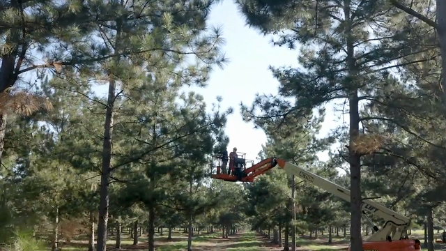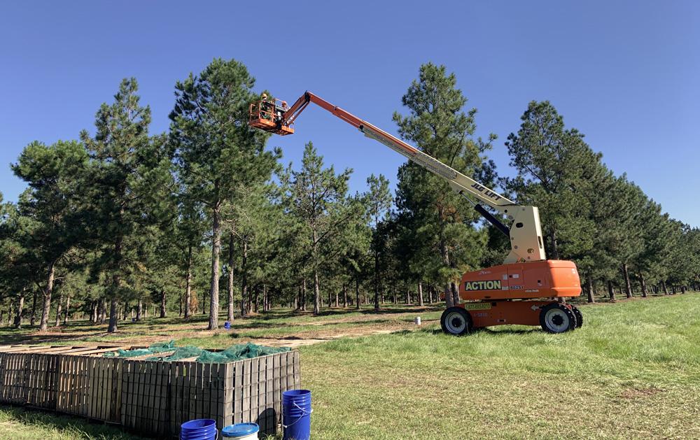 液压升降机深入树顶并小心清除锥形,逐分支切分锥体装进18-Bshel箱中,拖拉机拖车带入种子提取机,烤干锥体并处理种子并倾斜播料(脱机更容易栽培)。