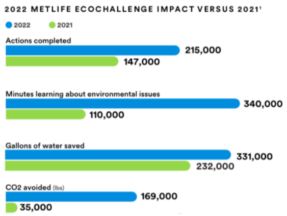 4 300多位40+市场同事参加了2022年MetLife生态挑战年度两周比赛鼓励同事接受绿色习惯自2020年以来参与挑战量翻三番,