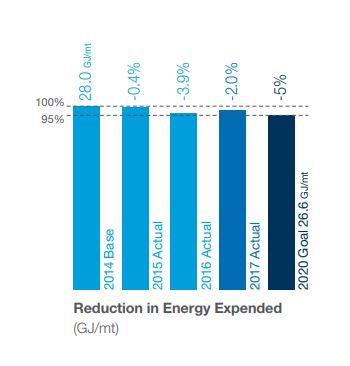 与2014年基准相比,我们的目标是将每吨产品耗能总量减少5%2017年,我们实现了2%下降并正步入实现该目标的正轨
