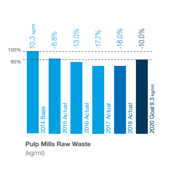高效使用原材料可提高前端成本节约,减少环境影响并降低废物处理相关费用实现这些效益,我们为编造和造纸过程领域单立目标造纸厂设定了5%减产目标,而纸浆厂定值减少10%物料损耗(我们在造纸厂流程下水道测量这些废流进入现场处理厂前)。过去几年效率项目继续支付分红,特别是在我们的Cloquet纸浆厂终于再次实现削减今年磨坊比2014年基准总减产18%反之,纸厂原生垃圾比2014年基线增加15%,驱动力主要来自PM1重建继续承诺到2020年实现5%下降