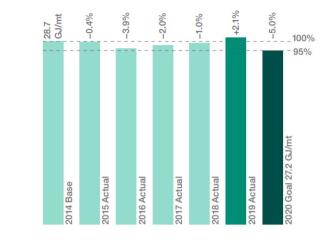 这是一个艰难的一年由市场环境影响极大。解决市场放缓,我们不得不减少操作,这意味着设备在不到满负荷运行,降低效率。缩减也意味着更少的纸生产,导致一个更大的影响在这个强度指标,因为它减少了分母。基于近年来的结果,项目已确定驱动能源效率接近目标性能。