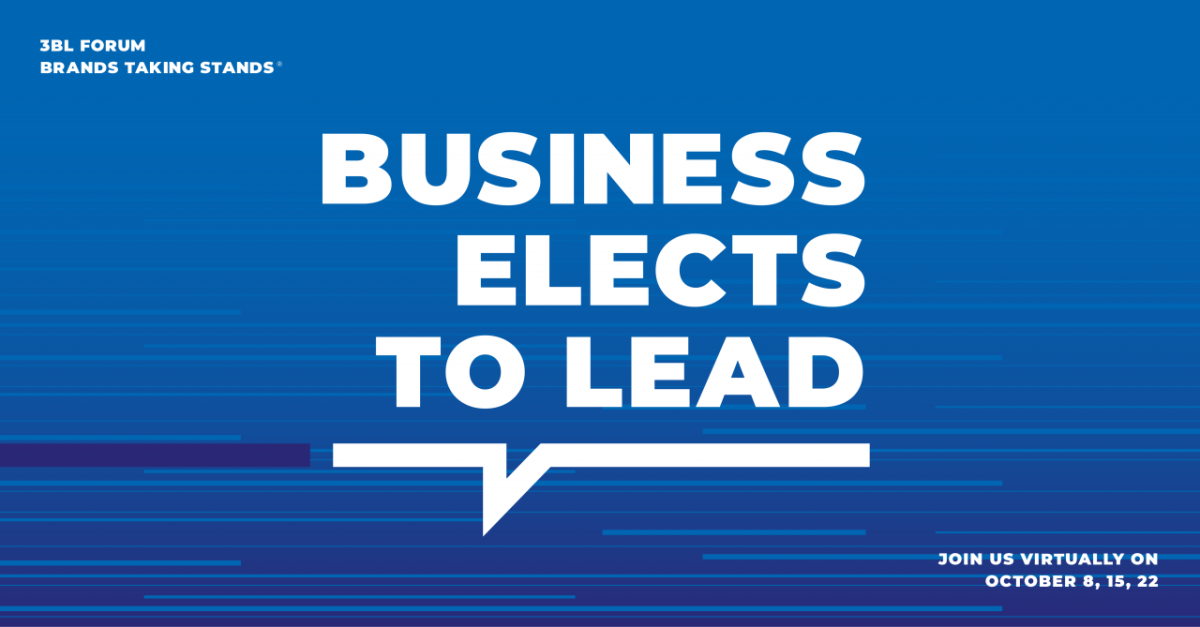 今年10月,3BL论坛:品牌采用Stands®-业务选择领导将召集顶级品牌和公司领导力,以围绕公司对Covid-19的企业反应进行真实而有意义的对话,种族和经济正义运动,公司主导的Get Get- 投票计划和环境,社会,治理(ESG)因素通过我们快速变化的观点的视角。我们将通过探索期望以及从这里去哪里来结束它。